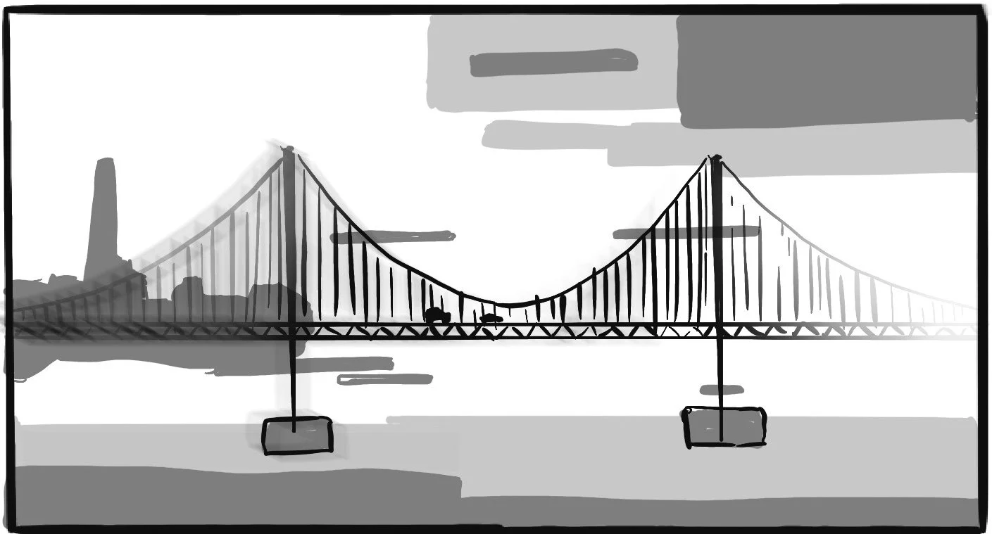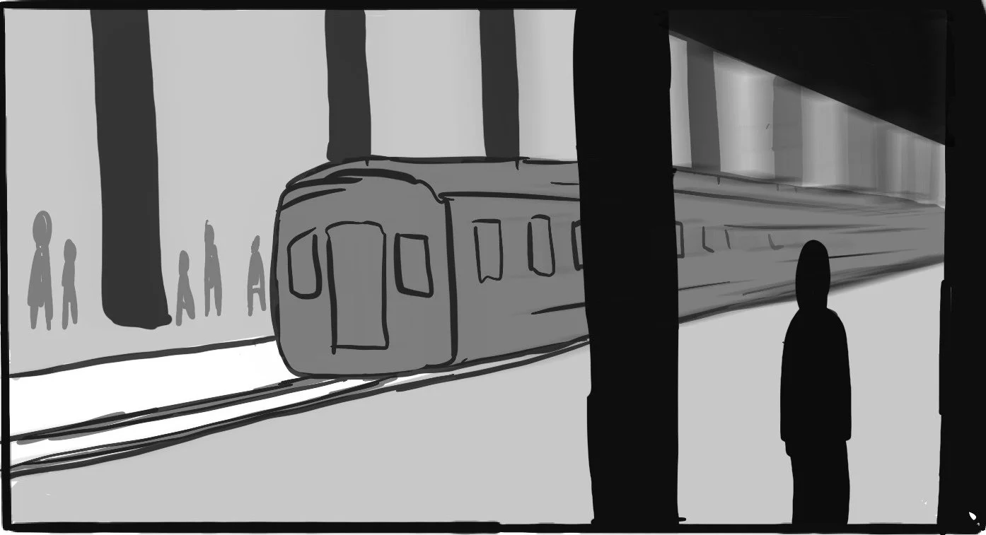Some initial sketches for boards created to expand the sequence to a full 24 frames. It was important to begin with rough ideas and comparing them to the final frames showcases how they informed the design.